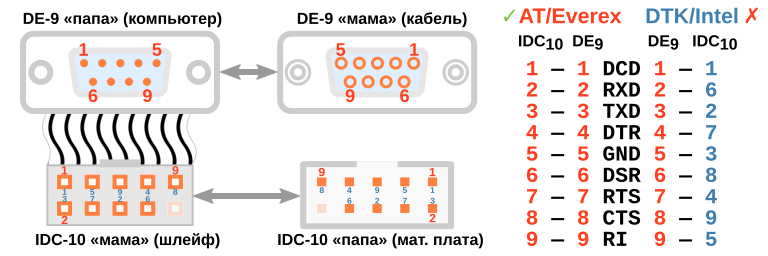 Разводка линий интерфейса RS-232 в разъёмах DE-9 и IDC-10